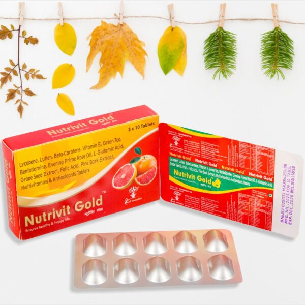 Nutrivit Gold Tablets (Lycopene+ Lutien + Beta-Carotene + Vitamin E + Green-Tea + Benfotiamine + Evening Prime Rose Oil + L-Glutamic Acid + Grape Seed Extract + Folic Acid + Pine Bark Extract + Multivitamins & Antioxidants)