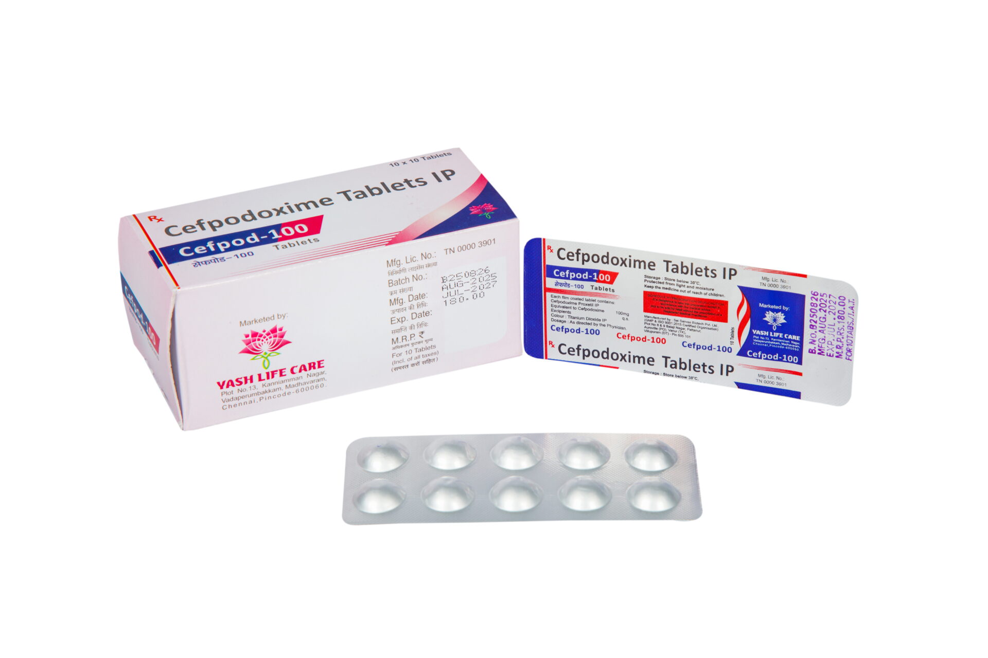 Cefpod-100™ Tablets contain Cefpodoxime Proxetil IP 100 mg, a third-generation cephalosporin antibiotic that works by inhibiting bacterial cell wall synthesis, leading to effective elimination of infection-causing bacteria.