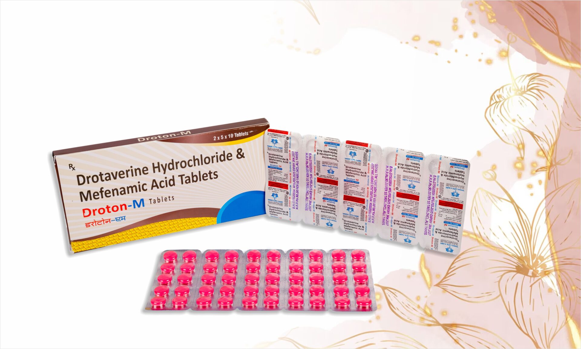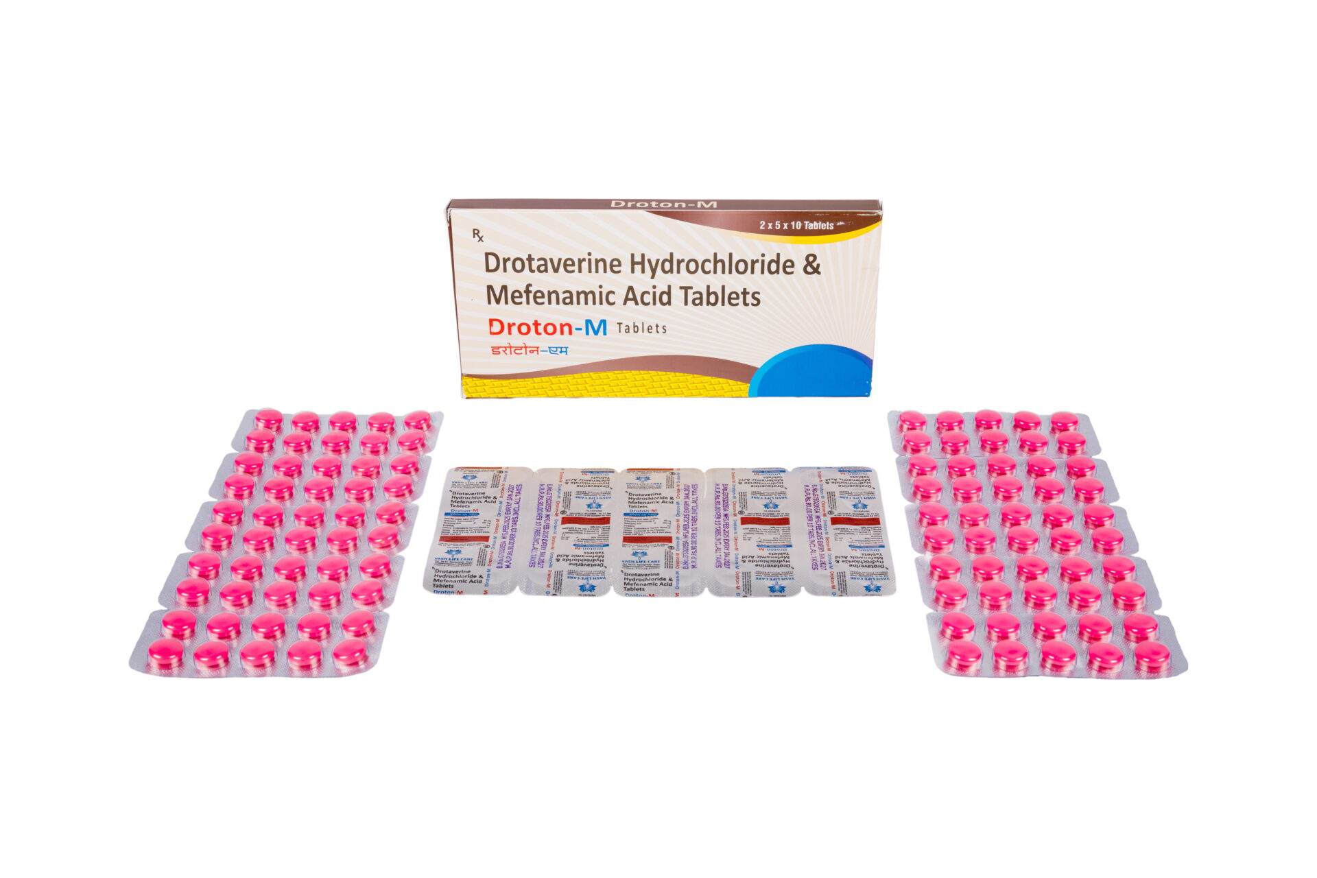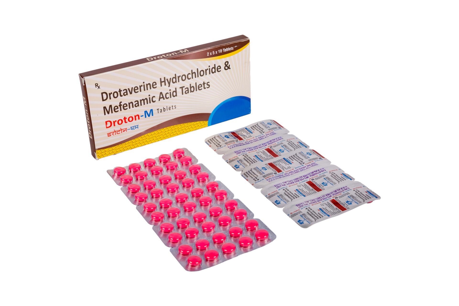 Droton-M Tablets combination of two medicines: Drotaverine and Mefenamic Acid, which relieves abdominal pain and cramps. Drotaverine is an anti-spasmodic medicine which relieves contractions (spasms) associated with smooth muscles in the abdomen. Mefenamic Acid is a non-steroidal anti-inflammatory drug (NSAID). It works by blocking the release of certain chemical messengers that cause abdominal pain and inflammation (swelling).