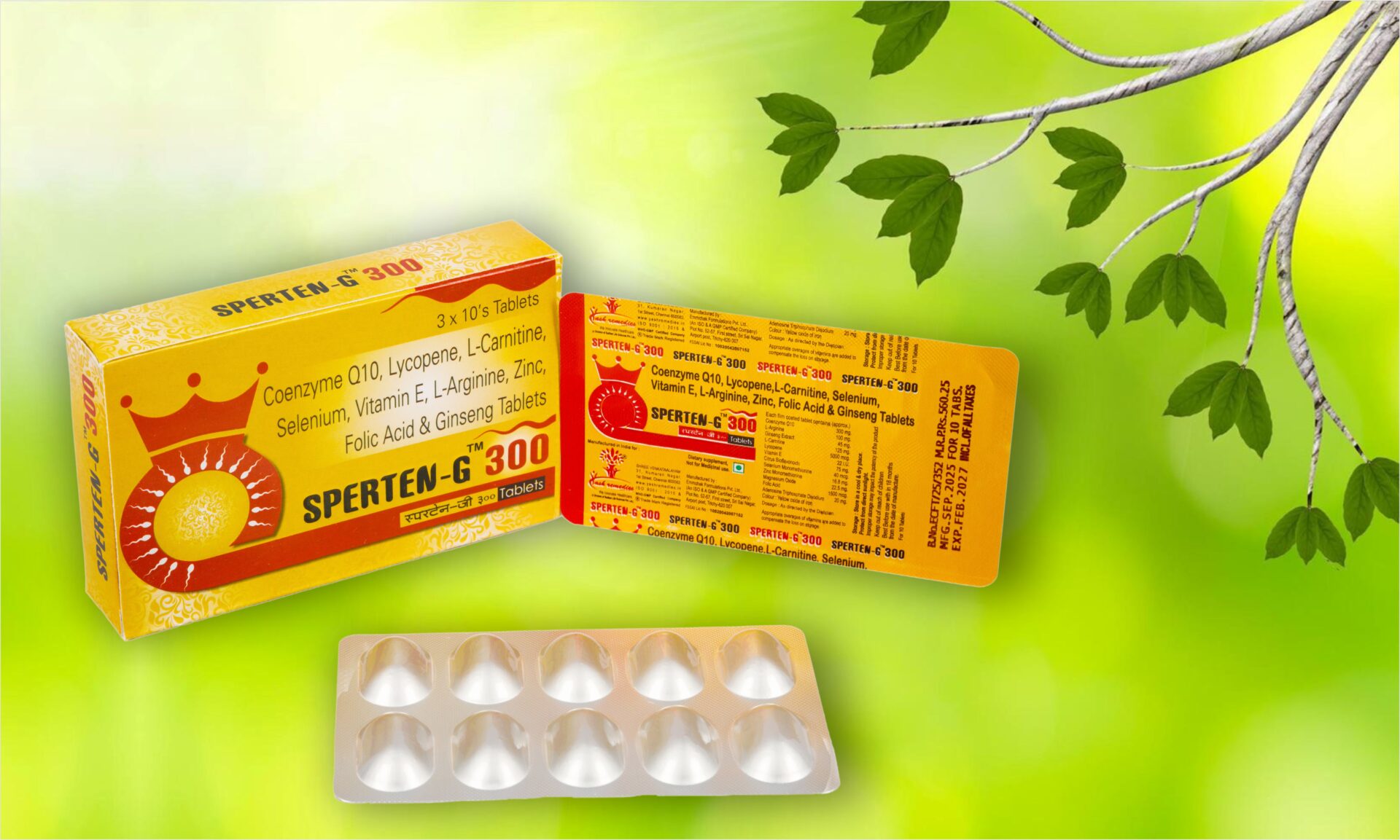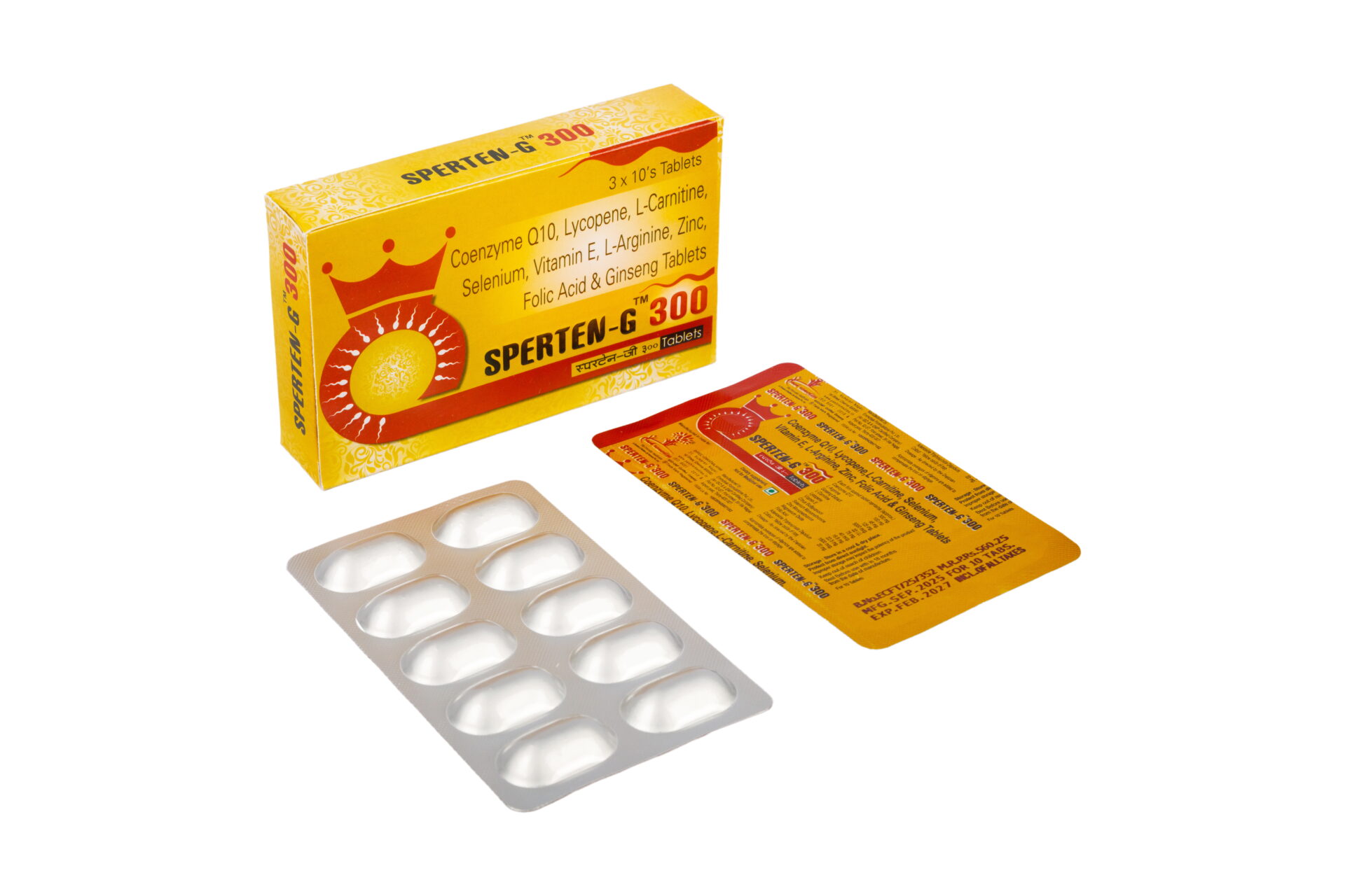 Sperten-G 300 Tablets combination of Coenzyme Q10, Lycopene, L-Carnitine, Selenium, Vitamin E, L-Arginine, Zinc, Folic Acid, and Ginseng is a potent nutraceutical blend specifically formulated to enhance male fertility by addressing oxidative stress, cellular energy, and hormonal balance.